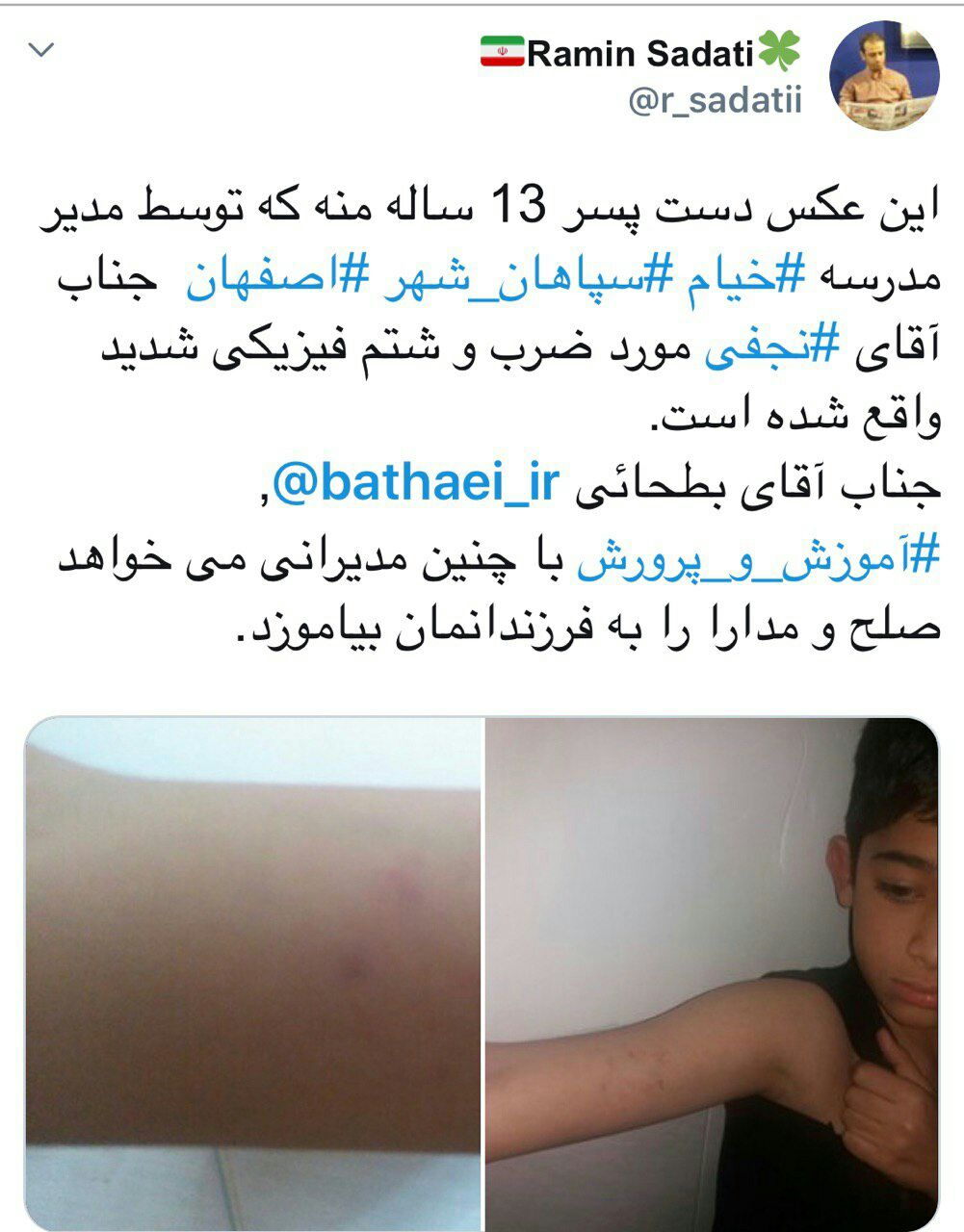 پدر این دانش آموز اصفهان ی در توئیتی نسبت به اقدام این مدیر اعتراض کرده و خواستار پیگیری آن توسط وزیر آموزش و پرورش شده است. 10